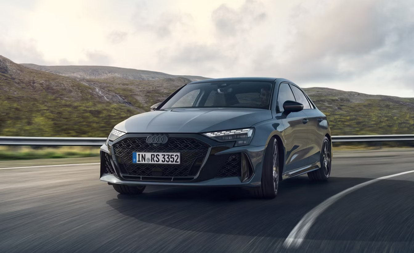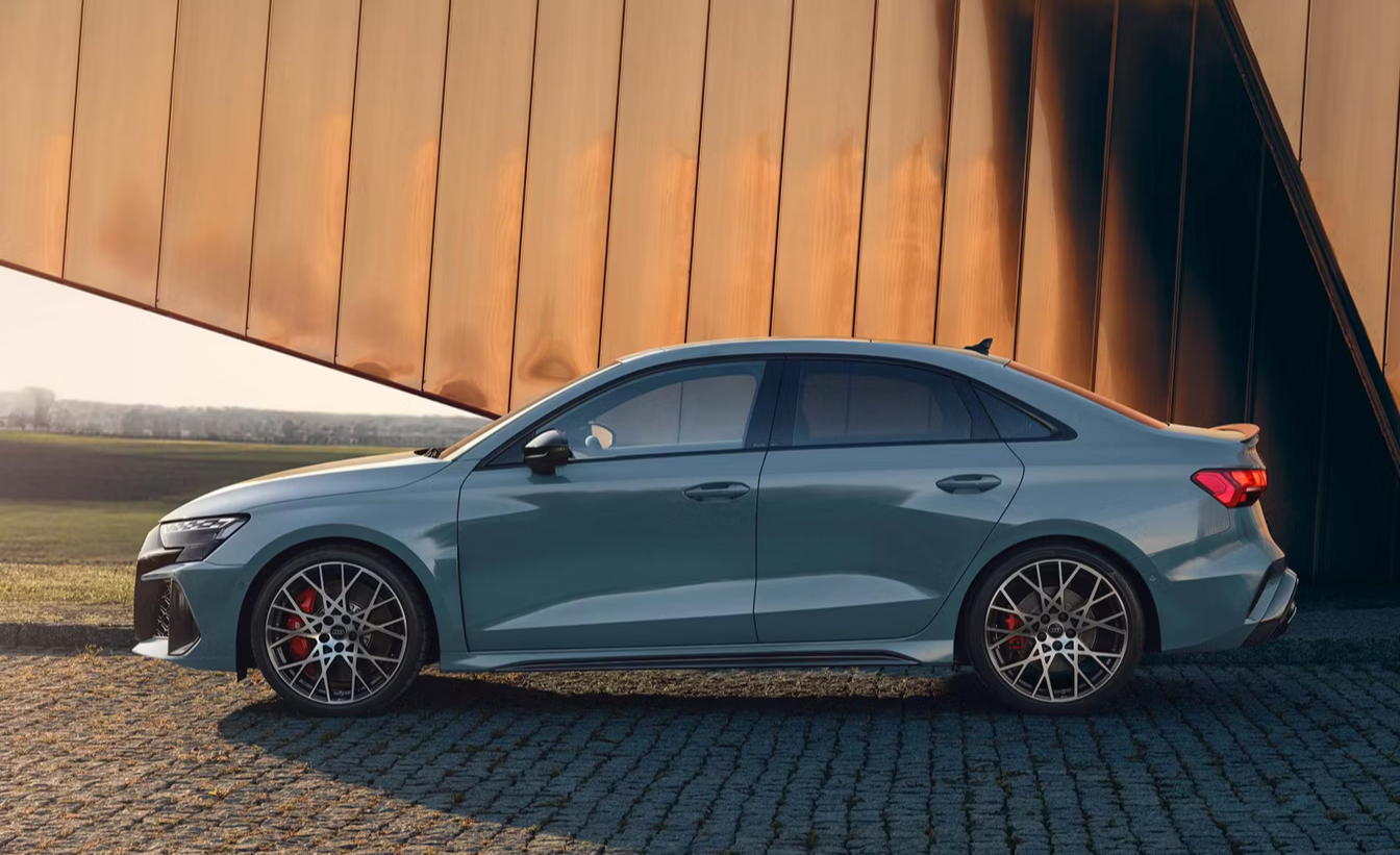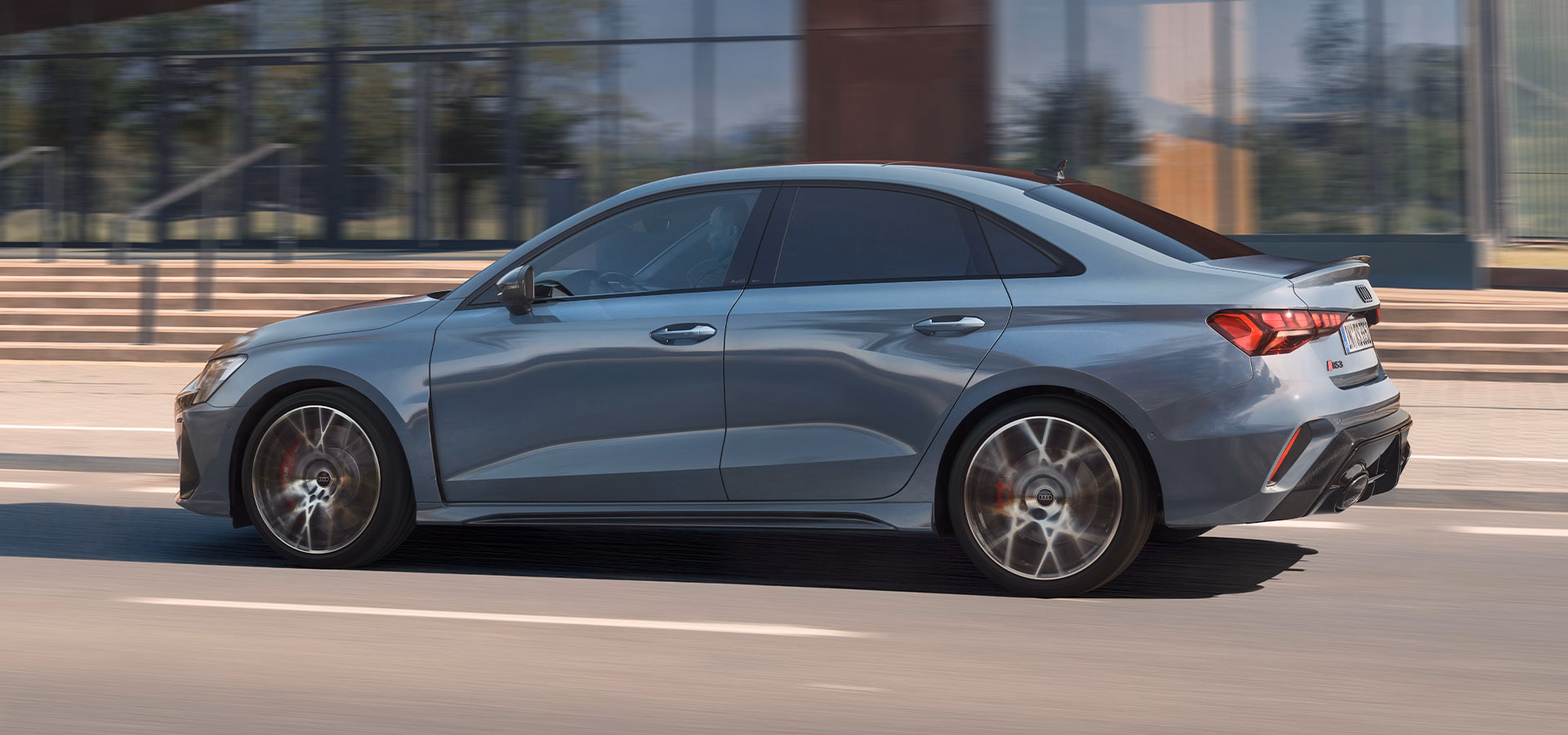 Los elementos exclusivos RS y las líneas aerodinámicas del nuevo Audi RS 3 Sedan2 muestran su carácter deportivo, especialmente en Gris Kemora metalizado4.