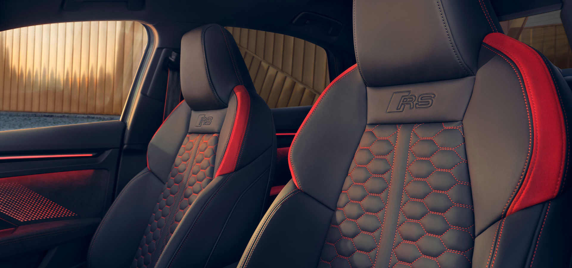 Los asientos deportivos delanteros de napa fina con diseño en forma de panal², grabado RS y costuras de contraste en rojo Express² proporcionan una sujeción lateral única. El aspecto deportivo se complementa armoniosamente con la sección de tela retroiluminada en las puertas delanteras.