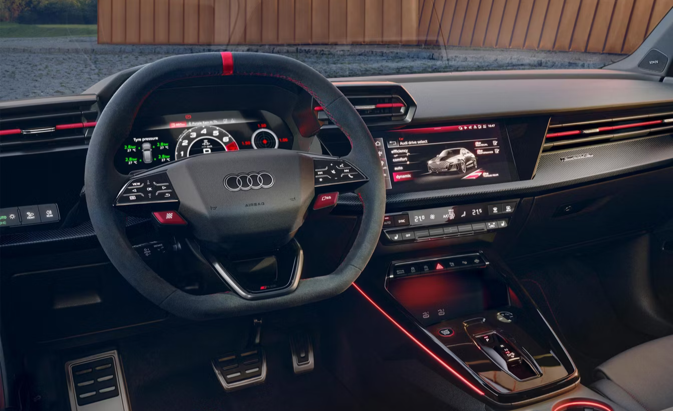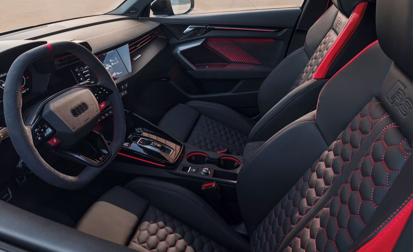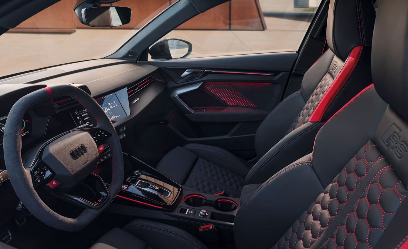 Experimenta las emociones que solo el Audi RS 3 Sedan puede ofrecer, gracias a los elementos exclusivos RS, como los asientos envolventes RS delanteros, el volante achatado con contorno deportivo y los acabados de alta calidad en óptica de vanadio.