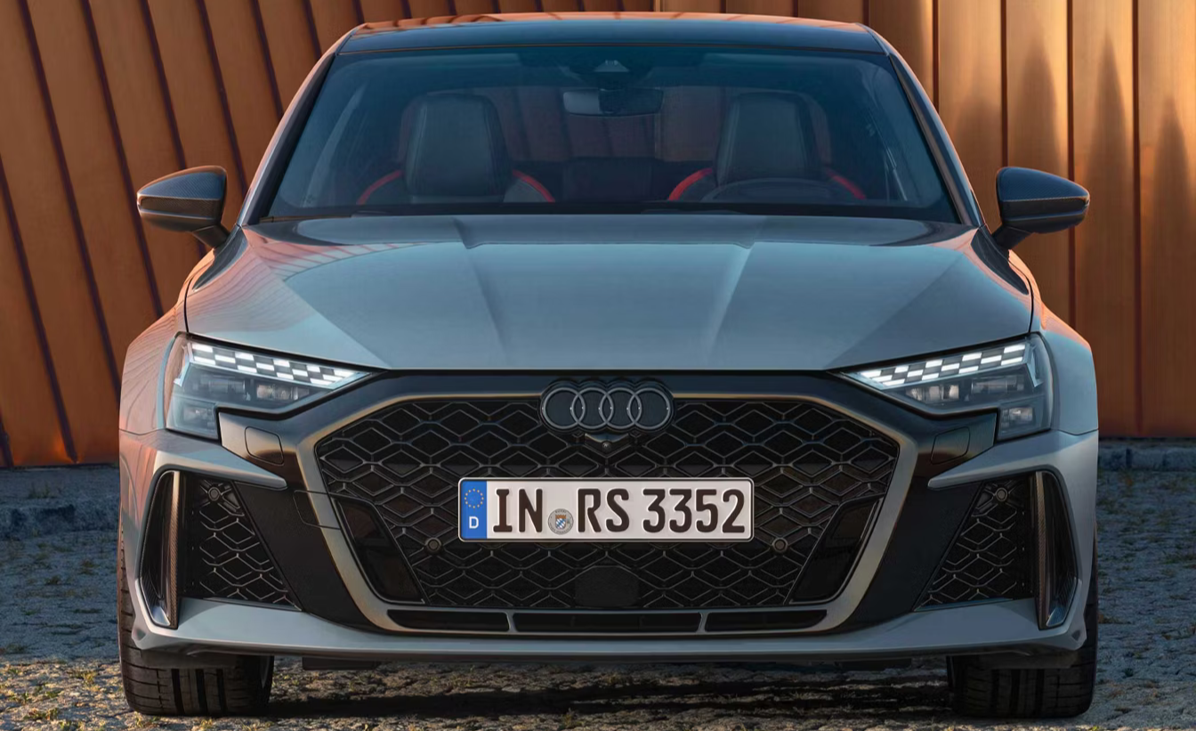 El frontal del nuevo Audi RS 3 Sedan2 muestra la fuerza que se oculta bajo el el capó, mediante grandes entradas de aire en negro mate, un spoiler delantero en carbono4 con rejilla de rombos, parrilla Audi Singleframe con estructura de panal y aros Audi en gris antracita.